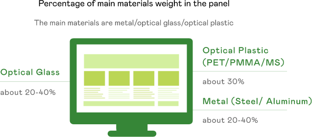 AUO's main product is display panels, with the main raw materials used in panel manufacturing being glass substrates and LCD module displays manufactured through semiconductor processes, along with related components and material assembly. In order to select raw materials with low environmental impact and risk, we conduct a critical raw material analysis assessment on the raw materials we use during the product life cycle's raw material stage, including material composition and weight proportions. Based on the analysis results, we identify critical raw materials and prioritize the use of recycled materials.